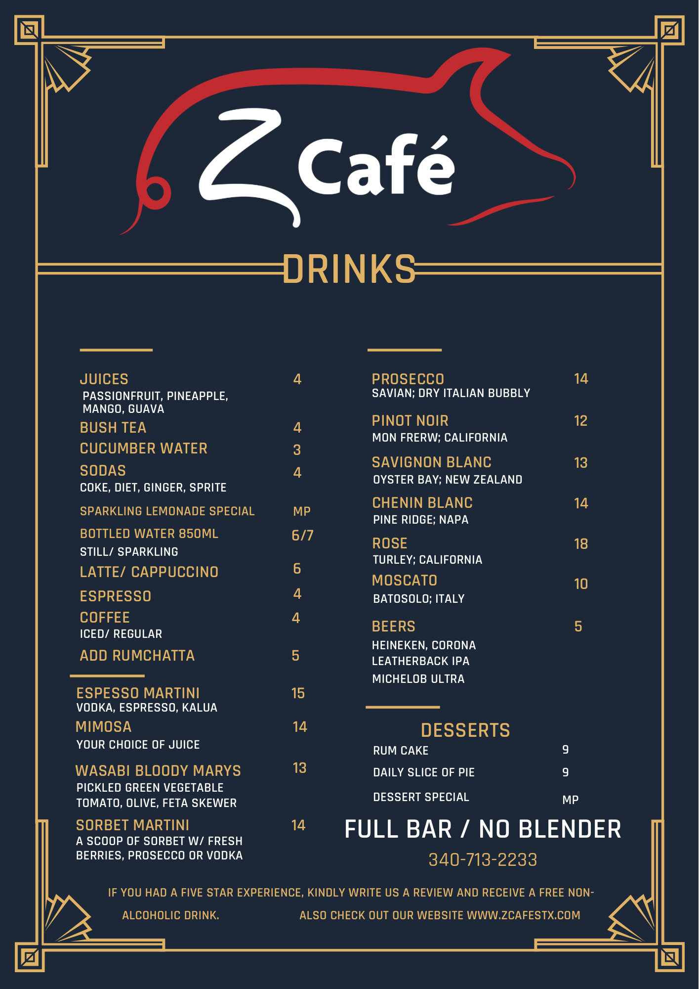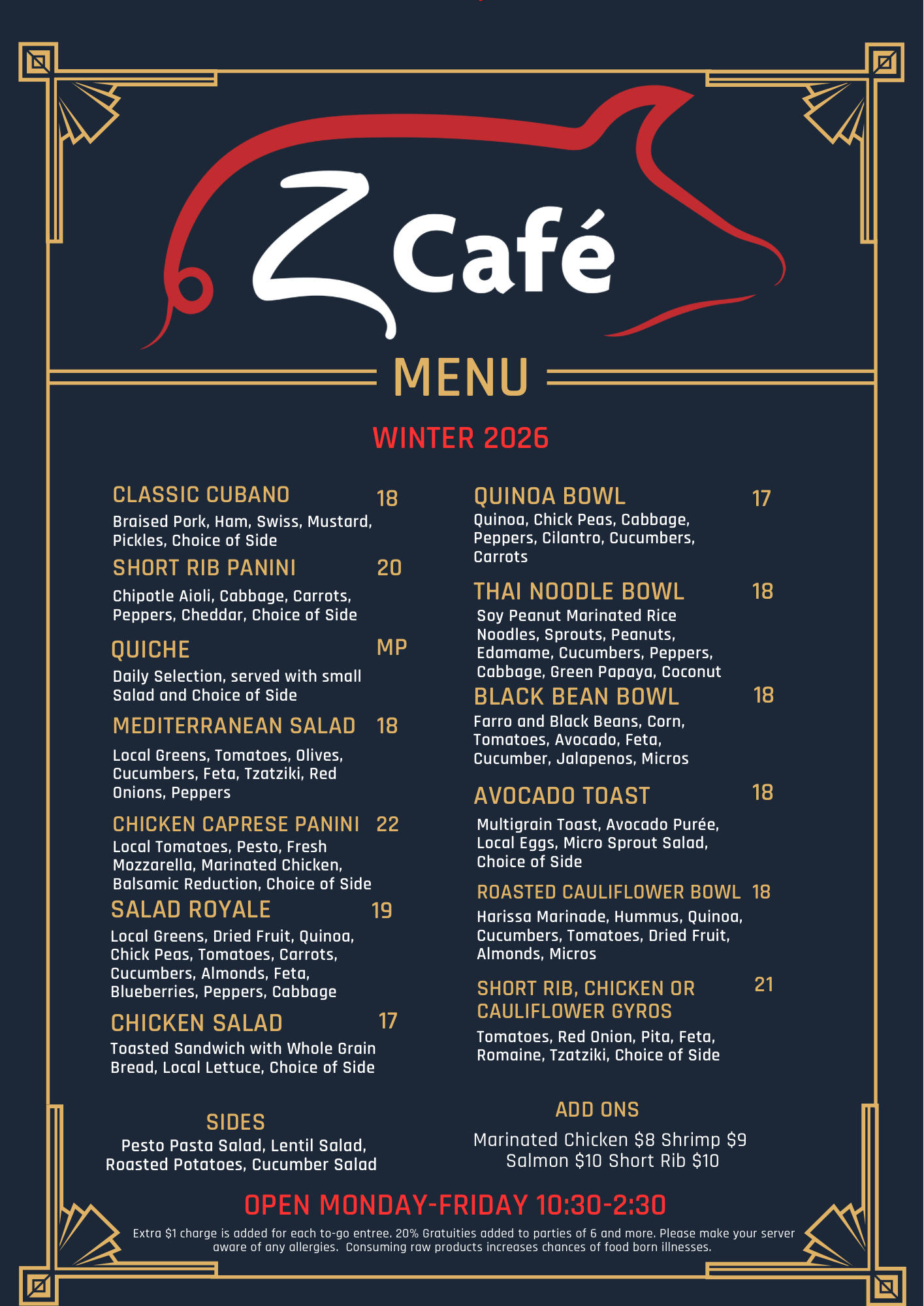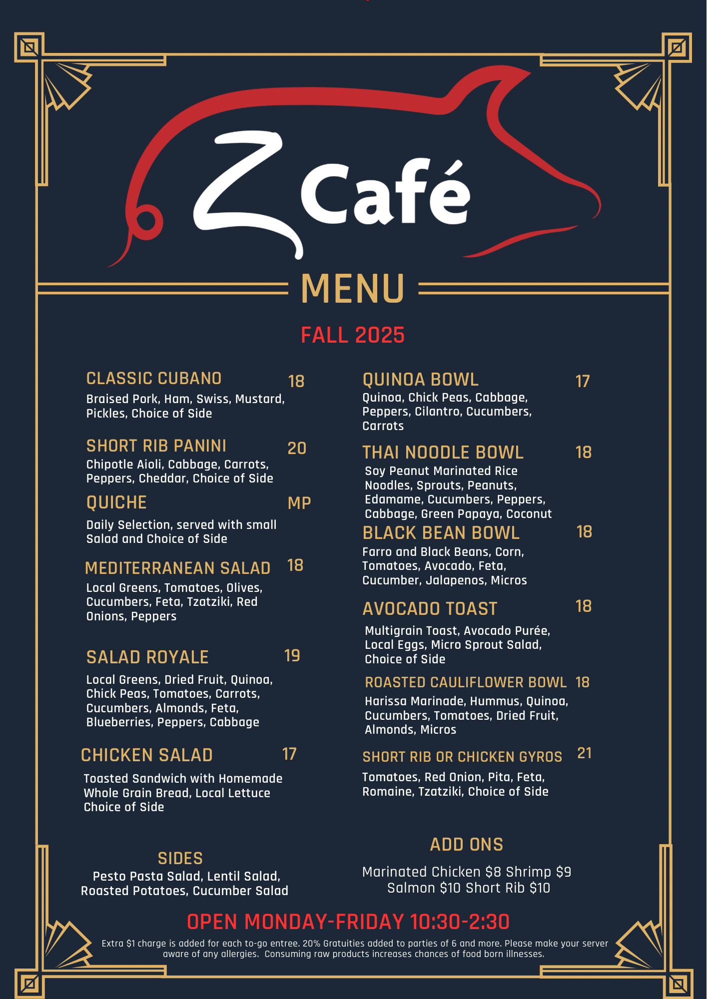 Check out our latest menu and taste the magic of our chef's culinary artistry. Come and visit us at the Pentheny Building on 46 King Street, Christiansted St. Croix, Virgin Islands. We're open Monday to Friday from 10:30am to 2:30 pm. We can't wait to see you at Z Cafe!